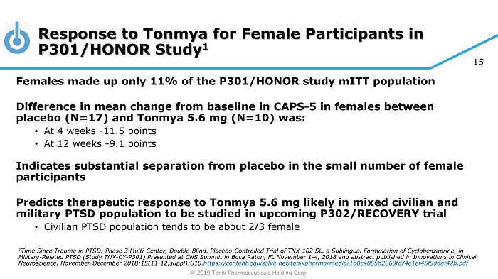 © 2019 Tonix Pharmaceuticals Holding Corp. 14 Adverse Events (AEs) in P201/AtEase and P301/HONOR Studies No serious or unexpected AEs in P201 or P301 related to Tonmya • Systemic AEs comparable between studies and also consistent with those described in approved oral cyclobenzaprine product labeling • Severity and incidence of oral hypoesthesia (oral numbness) are not dose related and similar in both studies # only adverse events (AEs) are listed that are at a rate of ≥ 5% in any TNX - treated group *no values in a row for either study means the AE in the active group(s) in that study was at a rate of <5%