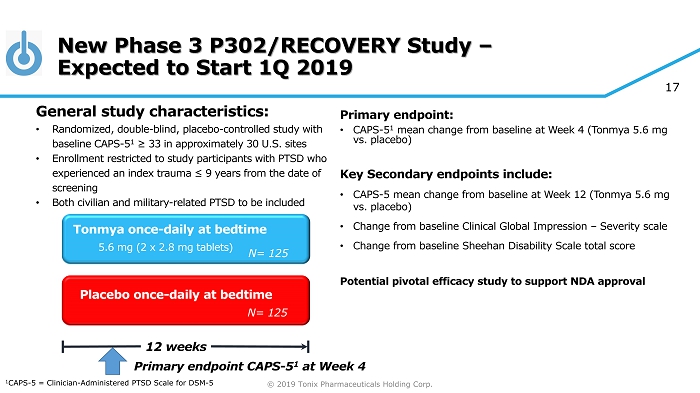 © 2019 Tonix Pharmaceuticals Holding Corp. 16 Non - combat traumas studied are similar to traumas experienced in civilian populations with PTSD To determine the therapeutic effects of Tonmya 5.6 mg in a mixed civilian and military population, difference in MCFB in CAPS - 5 was assessed in non - combat traumas in ≤9 years TST subgroup (placebo N=14, Tonmya 5.6 mg N=10): • At 4 weeks - 4.8 points • At 12 weeks - 4.4 points Non - combat traumas treated with Tonmya 5.6 mg showed clinically meaningful separation from placebo at Weeks 4 and 12, suggesting a mixed civilian and military sample within 9 years of index trauma may show a therapeutic response to Tonmya 1 Time Since Trauma in PTSD: Phase 3 Multi - Center, Double - Blind, Placebo - Controlled Trial of TNX - 102 SL, a Sublingual Formulation of Cyclobenzaprine, in Military - Related PTSD (Study TNX - CY - P301) Presented at CNS Summit in Boca Raton, FL November, 2018 and abstr act published in Innovations in Clinical Neuroscience, November - December 2018;15(11 - 12,suppl):S10. https://content.equisolve.net/tonixpharma/media/1d0c4055b2863fc74e1ef45f9ddaf42b.pdf Response to Tonmya for Non - Combat Traumas in P301/HONOR Study in ≤9 Years Time Since Trauma Subgroup 1 CAPS - 5=Clinician - Administered PTSD Scale for DSM - 5; MCFB=mean change from baseline; mITT =modified Intent - to - Treat sample; TST=time since trauma