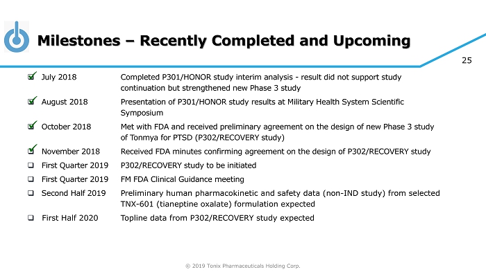 © 2019 Tonix Pharmaceuticals Holding Corp. 24 Management Team Seth Lederman, MD President & CEO Jessica Morris Chief Operating Officer Gregory Sullivan, MD Chief Medical Officer Bradley Saenger, CPA Chief Financial Officer