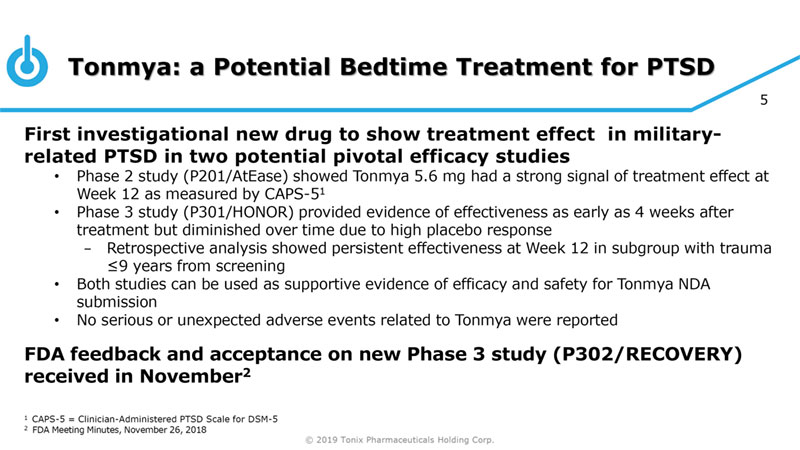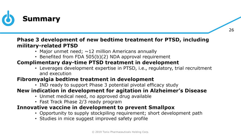 Milestones – Recently Completed and Upcoming 25 July 2018 Completed P301/HONOR study interim analysis - result did not support study continuation but strengthened new Phase 3 study August 2018 Presentation of P301/HONOR study results at Military Health System Scientific Symposium October 2018 Met with FDA and received preliminary agreement on the design of new Phase 3 study of Tonmya for PTSD (P302/RECOVERY study) November 2018 Received FDA minutes confirming agreement on the design of P302/RECOVERY study March 2019 FM FDA Clinical Guidance meeting completed March 2019 P302/RECOVERY study initiated Second Half 2019 Preliminary human pharmacokinetic and safety data (non-IND study) from selected TNX-601 (tianeptine oxalate) formulation expected First Half 2020 Topline data from P302/RECOVERY study expected © 2019 Tonix Pharmaceuticals Holding Corp.
