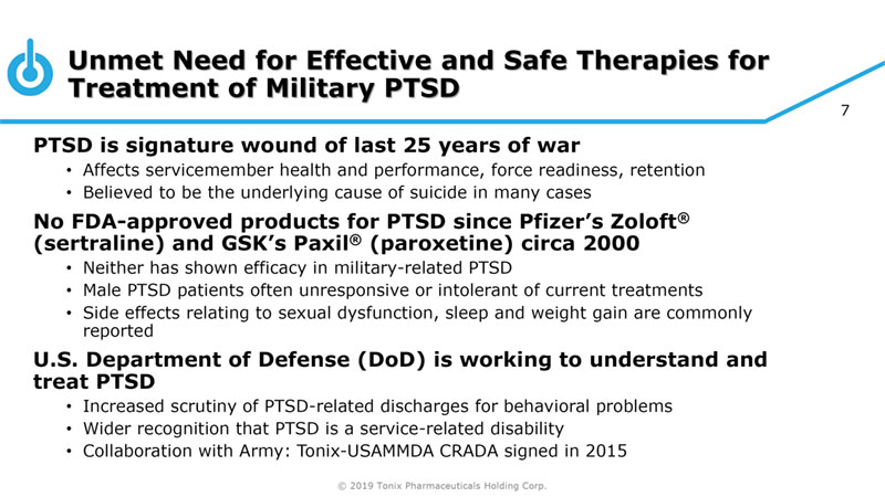 Prevalence of PTSD Among Civilians and Veterans 6 4.7% 19-31% >19% Adult population1 Vietnam veterans2 Iraq/Afghanistan3 12 million American adults annually1 Women more likely to develop than men1 1Goldstein et al., 2016 (adjusted for 2019); 2Norris, PTSD Res Quar. 2013; 3Analysis of VA Health Care Utilization among Operation Enduring Freedom, Operation Iraqi Freedom, and Operation New Dawn Veterans, from 1st Qtr FY 2002 through 2nd Qtr FY 2015, Washington, DC; Among 1.9M separated OEF/OIF/OND veterans, 1.2M have obtained VA healthcare; 685k evaluated by VA with possible mental disorder, and 379k diagnosed with PTSD. © 2019 Tonix Pharmaceuticals Holding Corp.