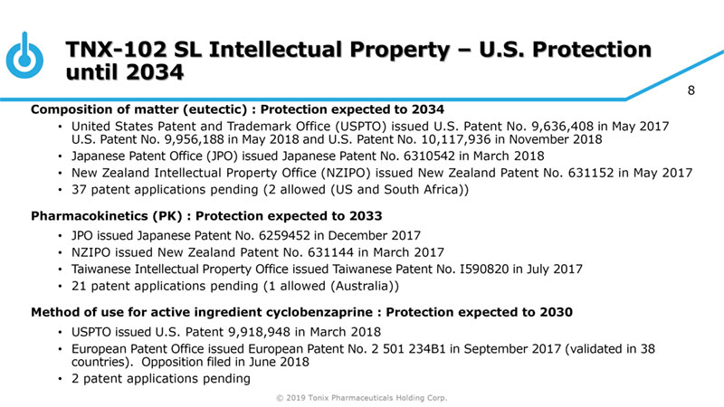 TNX 102 SL Intellectual Property – U.S. Protection until 2034 8 Composition of matter (eutectic) : Protection expected to 2034 • United States Patent and Trademark Office (USPTO) issued U.S. Patent No. 9,636,408 in May 2017 U.S. Patent No. 9,956,188 in May 2018 and U.S. Patent No. 10,117,936 in November 2018 • Japanese Patent Office (JPO) issued Japanese Patent No. 6310542 in March 2018 • New Zealand Intellectual Property Office (NZIPO) issued New Zealand Patent No. 631152 in May 2017 • 37 patent applications pending (2 allowed (US and South Africa)) Pharmacokinetics (PK) : Protection expected to 2033 • JPO issued Japanese Patent No. 6259452 in December 2017 • NZIPO issued New Zealand Patent No. 631144 in March 2017 • Taiwanese Intellectual Property Office issued Taiwanese Patent No. I590820 in July 2017 • 21 patent applications pending (1 allowed (Australia)) Method of use for active ingredient cyclobenzaprine : Protection expected to 2030 • USPTO issued U.S. Patent 9,918,948 in March 2018 • European Patent Office issued European Patent No. 2 501 234B1 in September 2017 (validated in 38 countries). Opposition filed in June 2018 • 2 patent applications pending © 2019 Tonix Pharmaceuticals Holding Corp.