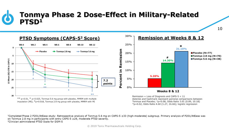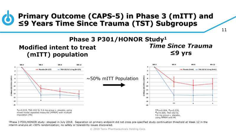 Tonmya Phase 2 Dose Effect in Military Related PTSD1 10 PTSD Symptoms (CAPS-52 Score) 30% Remission at Weeks 8 & 12 25% * 21.10% 20% Placebo (N=77) Tonmya 2.8 mg (N=70) # Tonmya 5.6 mg (N=38) 15% 14.30% 10% 5.20% 5% 7.2 points Percent in Remission 0% Weeks 8 & 12 Remission = Loss of Diagnosis and CAPS-5 < 11 ** p<0.01, * p<0.025, Tonmya 5.6 mg group with placebo, MMRM with multiple Asterisk and hashmark represent pairwise comparisons between imputation (MI); *p=0.018, Tonmya 2.8 mg group with placebo, MMRM with MI Tonmya and Placebo; #p=0.08, Odds Ratio 3.01 (0.89, 10.18) *p=0.02, Odds Ratio 4.60 (1.27, 16.66); logistic regression 1Completed Phase 2 P201/AtEase study: Retrospective analysis of Tonmya 5.6 mg on CAPS-5 33 (high-moderate) subgroup. Primary analysis of P201/AtEase was on Tonmya 2.8 mg in participants with entry CAPS-5 29, moderate PTSD severity. 2Clinician administered PTSD Scale for DSM-5 © 2019 Tonix Pharmaceuticals Holding Corp.