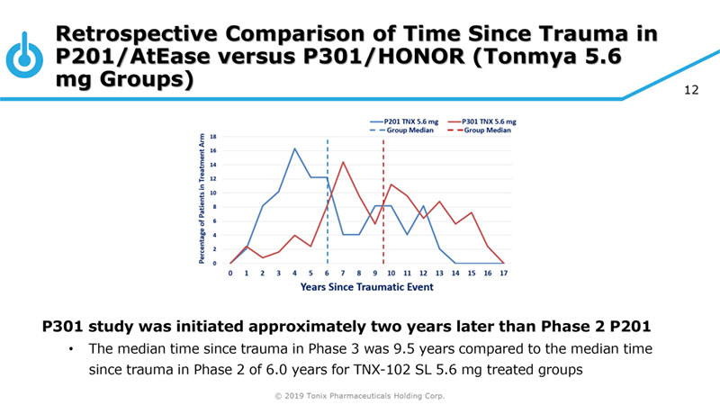 Retrospective Comparison of Time Since Trauma in P201/AtEase versus P301/HONOR (Tonmya 5.6 mg Groups) 12 P301 study was initiated approximately two years later than Phase 2 P201 • The median time since trauma in Phase 3 was 9.5 years compared to the median time since trauma in Phase 2 of 6.0 years for TNX-102 SL 5.6 mg treated groups © 2019 Tonix Pharmaceuticals Holding Corp.