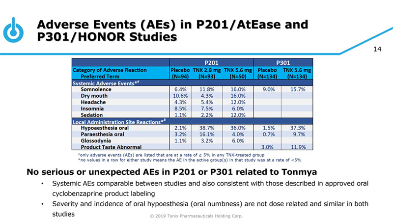 Sustained Remission in Phase 2 and Phase 3 Studies: Retrospective Analyses of P201 Entry CAPS 5 33 and P301 9 Years Since Trauma Subgroups 13 Remission is a clinical state that is essentially asymptomatic In order to confirm remission: • Determined rates of participants who met remission status at both Week 8 and Week 12 Rate of remission in 9 years since trauma group in P301 is similar to baseline CAPS-5 33 group in P2011 1Majority of P201 participants were 9 years since trauma and ~80% of P201 participants and all of P301 participants were 33 CAPS-5 at baseline © 2019 Tonix Pharmaceuticals Holding Corp.