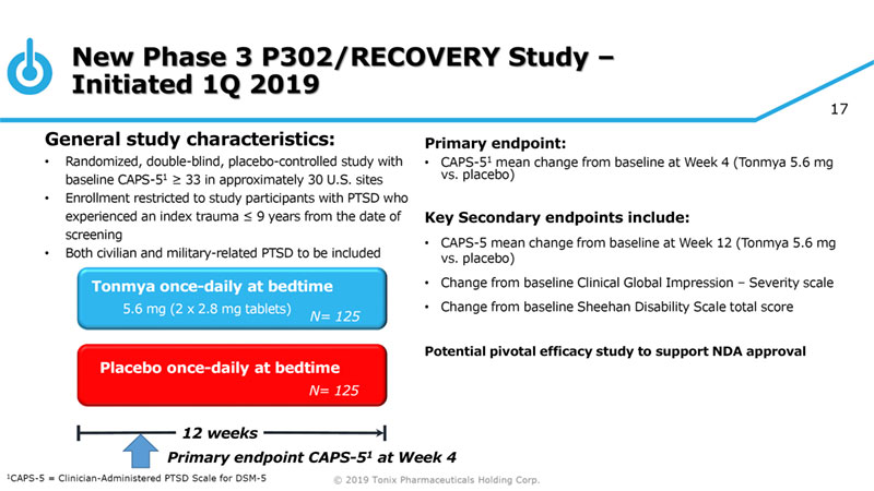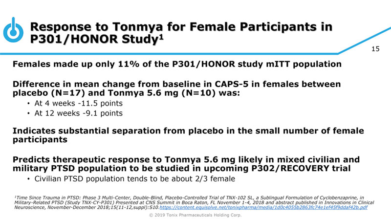 Response to Tonmya for Non Combat Traumas in P301/HONOR Study in 9 Years Time Since Trauma Subgroup1 16 Non-combat traumas studied are similar to traumas experienced in civilian populations with PTSD To determine the therapeutic effects of Tonmya 5.6 mg in a mixed civilian and military population, difference in MCFB in CAPS-5 was assessed in non-combat traumas in 9 years TST subgroup (placebo N=14, Tonmya 5.6 mg N=10): • At 4 weeks -4.8 points • At 12 weeks -4.4 points Non-combat traumas treated with Tonmya 5.6 mg showed clinically meaningful separation from placebo at Weeks 4 and 12, suggesting a mixed civilian and military sample within 9 years of index trauma may show a therapeutic response to Tonmya 1Time Since Trauma in PTSD: Phase 3 Multi-Center, Double-Blind, Placebo-Controlled Trial of TNX-102 SL, a Sublingual Formulation of Cyclobenzaprine, in Military-Related PTSD (Study TNX-CY-P301) Presented at CNS Summit in Boca Raton, FL November, 2018 and abstract published in Innovations in Clinical Neuroscience, November-December 2018;15(11-12,suppl):S10.https://content.equisolve.net/tonixpharma/media/1d0c4055b2863fc74e1ef45f9ddaf42b.pdf CAPS-5=Clinician-Administered PTSD Scale for DSM-5; MCFB=mean change from baseline; mITT=modified Intent-to-Treat sample; TST=time since trauma © 2019 Tonix Pharmaceuticals Holding Corp.