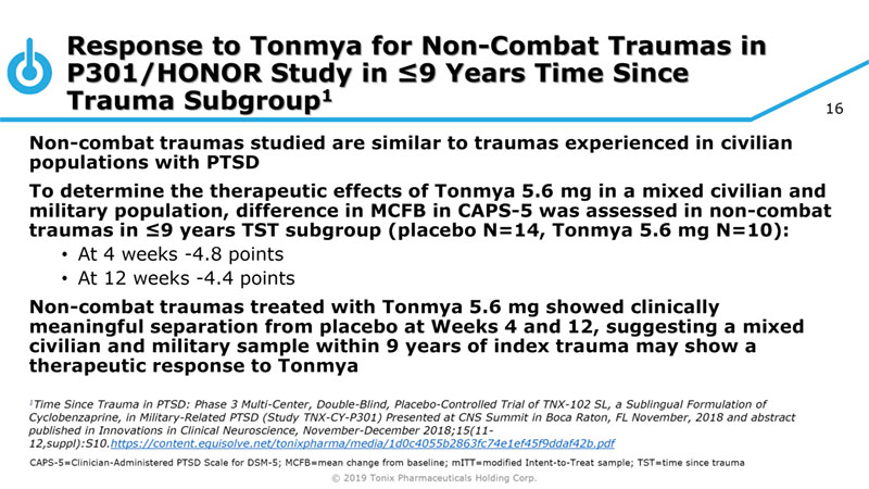 Response to Tonmya for Female Participants in P301/HONOR Study1 15 Females made up only 11% of the P301/HONOR study mITT population Difference in mean change from baseline in CAPS-5 in females between placebo (N=17) and Tonmya 5.6 mg (N=10) was: • At 4 weeks -11.5 points • At 12 weeks -9.1 points Indicates substantial separation from placebo in the small number of female participants Predicts therapeutic response to Tonmya 5.6 mg likely in mixed civilian and military PTSD population to be studied in upcoming P302/RECOVERY trial • Civilian PTSD population tends to be about 2/3 female 1Time Since Trauma in PTSD: Phase 3 Multi-Center, Double-Blind, Placebo-Controlled Trial of TNX-102 SL, a Sublingual Formulation of Cyclobenzaprine, in Military-Related PTSD (Study TNX-CY-P301) Presented at CNS Summit in Boca Raton, FL November 1-4, 2018 and abstract published in Innovations in Clinical Neuroscience, November-December 2018;15(11-12,suppl):S10.https://content.equisolve.net/tonixpharma/media/1d0c4055b2863fc74e1ef45f9ddaf42b.pdf © 2019 Tonix Pharmaceuticals Holding Corp.