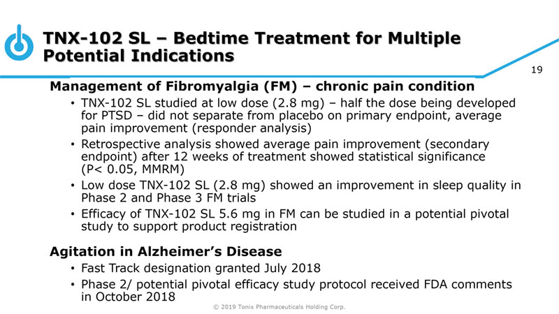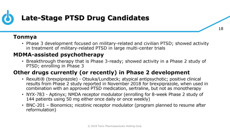 Late Stage PTSD Drug Candidates 18 Tonmya • Phase 3 development focused on military-related and civilian PTSD; showed activity in treatment of military-related PTSD in large multi-center trials MDMA-assisted psychotherapy • Breakthrough therapy that is Phase 3-ready; showed activity in a Phase 2 study of PTSD; enrolling in Phase 3 Other drugs currently (or recently) in Phase 2 development • Rexulti® (brexpiprazole) - Otsuka/Lundbeck; atypical antipsychotic; positive clinical results from Phase 2 study reported in November 2018 for brexpiprazole, when used in combination with an approved PTSD medication, sertraline, but not as monotherapy • NYX-783 - Aptinyx; NMDA receptor modulator (enrolling for 8-week Phase 2 study of 144 patients using 50 mg either once daily or once weekly) • BNC-201 – Bionomics; nicotinic receptor modulator (program planned to resume after reformulation) © 2019 Tonix Pharmaceuticals Holding Corp.