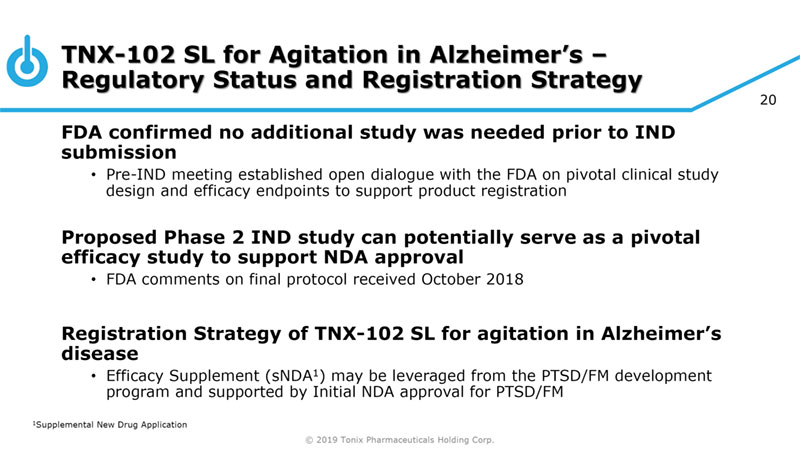 TNX 102 SL – Bedtime Treatment for Multiple Potential Indications 19 Management of Fibromyalgia (FM) – chronic pain condition • TNX-102 SL studied at low dose (2.8 mg) – half the dose being developed for PTSD – did not separate from placebo on primary endpoint, average pain improvement (responder analysis) • Retrospective analysis showed average pain improvement (secondary endpoint) after 12 weeks of treatment showed statistical significance (P< 0.05, MMRM) • Low dose TNX-102 SL (2.8 mg) showed an improvement in sleep quality in Phase 2 and Phase 3 FM trials • Efficacy of TNX-102 SL 5.6 mg in FM can be studied in a potential pivotal study to support product registration Agitation in Alzheimer’s Disease • Fast Track designation granted July 2018 • Phase 2/ potential pivotal efficacy study protocol received FDA comments in October 2018 © 2019 Tonix Pharmaceuticals Holding Corp.