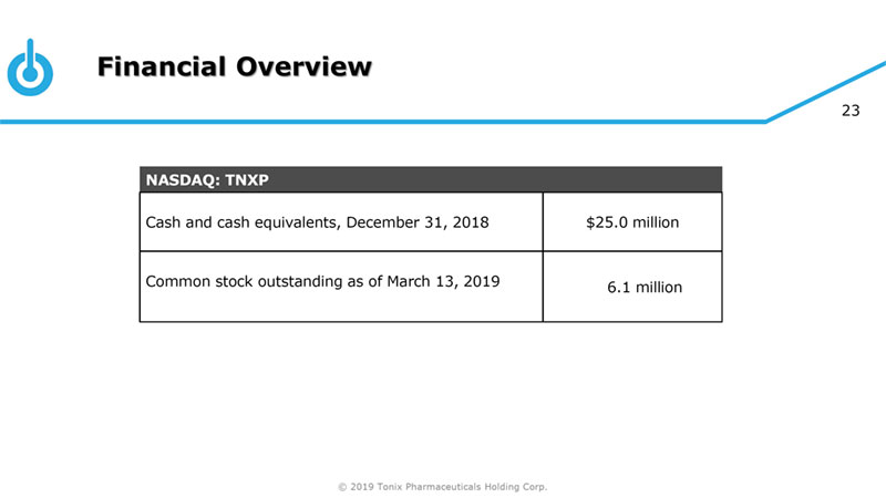 TNX 801 (Synthesized Live Horsepox Virus): A Smallpox Preventing Vaccine Candidate 22 Potential improvement over current biodefense tools against smallpox Leverages Tonix’s government affairs effort Collaboration with Professor David Evans and Dr. Ryan Noyce at University of Alberta Demonstrated protective vaccine activity in mice Patent application on novel vaccine submitted Pre-IND Stage Regulatory strategy • We intend to meet with FDA to discuss the most efficient and appropriate investigational plan to support the licensure, either: Application of the “Animal Rule”, or Conducting an active comparator study using ACAM2000 • Good Manufacturing Practice (GMP) viral production process in development Material threat medical countermeasure under 21st Century Cures Act Targeting a Potential Public • Qualifies for Priority Review Voucher (PRV) upon licensure* Health Issue PRVs have no expiration date, are transferrable and have sold for ~$125 M *BLA/NDA priority 6-month review is expected. © 2019 Tonix Pharmaceuticals Holding Corp.