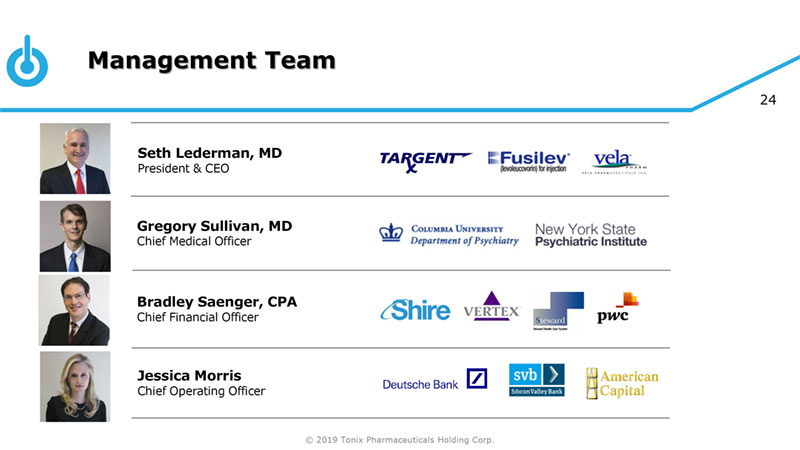 Financial Overview 23 NASDAQ: TNXP Cash and cash equivalents, December 31, 2018 $25.0 million Common stock outstanding as of March 13, 2019 6.1 million © 2019 Tonix Pharmaceuticals Holding Corp.