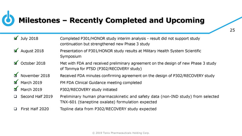 Management Team 24 Seth Lederman, MD President & CEO Gregory Sullivan, MD Chief Medical Officer Bradley Saenger, CPA Chief Financial Officer Jessica Morris Chief Operating Officer © 2019 Tonix Pharmaceuticals Holding Corp.