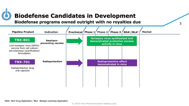 © 2019 Tonix Pharmaceuticals Holding Corp. 4 CNS Candidates in Development Psychiatry, Pain and Addiction Preclinical Phase 2 NDA 3 /BLA 4 Market Pipeline Product Indication Phase 3 TNX - 102 SL 1 Bedtime Treatment for PTSD – Tonmya ®2 Daytime Treatment for PTSD TNX - 601 Novel salt discovered and characterized; Preliminary human PK and safety data 6 from selected formulation expected 2H2019 TNX - 1300 5 Phase 2a completed – blocked physiological effects of cocaine challenge; Phase 2b - ready Cocaine intoxication / overdose Cyclobenzaprine HCl sublingual tablets Protectic ® formulation technology Tianeptine oxalate oral formulation Cocaine esterase (recombinant from bacteria) i.v. formulation Phase 1 1 TNX - 102 SL (cyclobenzaprine HCl sublingual tablets) is an investigational new drug and has not been approved for any indication; 2 Tonmya has been conditionally accepted by the U.S. FDA as the proposed trade name for TNX - 102 SL for the treatment of PTSD. 3 NDA - New Drug Application; 4 BLA – Biologic Licensing Application; 5 TNX - 1300 (T172R/G173Q double - mutant cocaine esterase 200 mg, i.v. solution) is an investigational new biologic and has not been approved for any indication; 6 non - Investigational New Drug (IND) study; Bedtime Treatment for Fibromyalgia TNX - 102 SL and TNX - 601 owned outright with no royalties due P302/ RECOVERY study initiated 1Q2019 Bedtime Treatment for Agitation in Alzheimer’s Fast Track Phase 2/3 ready program Treatment of Neurocognitive Dysfunction from Corticosteroids 2 efficacy studies completed at 2.8 mg; IND active to support Phase 3 using 5.6 mg