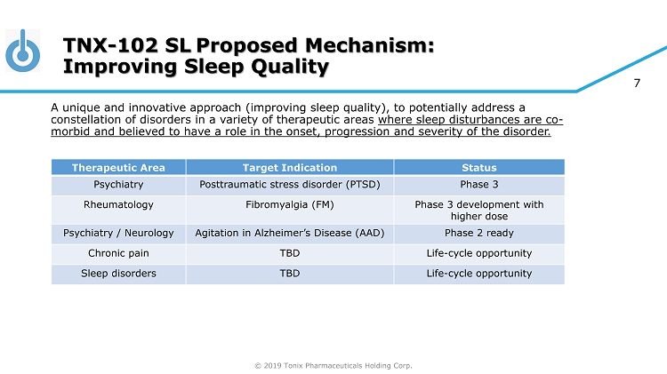 © 2019 Tonix Pharmaceuticals Holding Corp. 6 Lead Program: TNX - 102 SL – Product Concept Sleep disturbances are associated with a constellation of disorders • Considered co - morbid or a key symptom in these disorders • Believed to have a role in the onset, progression and severity of these disorders The focus of TNX - 102 SL development is both unique and innovative • Testing the therapeutic benefit of sleep (‘sleep quality’) − Restorative sleep, in contrast to time spent sleeping (‘sleep quantity’) • Targeting clinical conditions for which improved sleep quality may have a therapeutic benefit − Reduction in disease - specific symptoms, with sleep improvement as a secondary endpoint