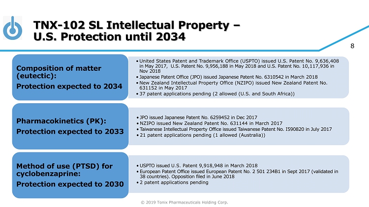 © 2019 Tonix Pharmaceuticals Holding Corp. 7 A unique and innovative approach (improving sleep quality), to potentially address a constellation of disorders in a variety of therapeutic areas where sleep disturbances are co - morbid and believed to have a role in the onset, progression and severity of the disorder. Therapeutic Area Target Indication Status Psychiatry Posttraumatic stress disorder (PTSD) Phase 3 Rheumatology Fibromyalgia (FM) Phase 3 development with higher dose Psychiatry / Neurology Agitation in Alzheimer’s Disease (AAD) Phase 2 ready Chronic pain TBD Life - cycle opportunity Sleep disorders TBD Life - cycle opportunity TNX - 102 SL Proposed Mechanism: Improving Sleep Quality