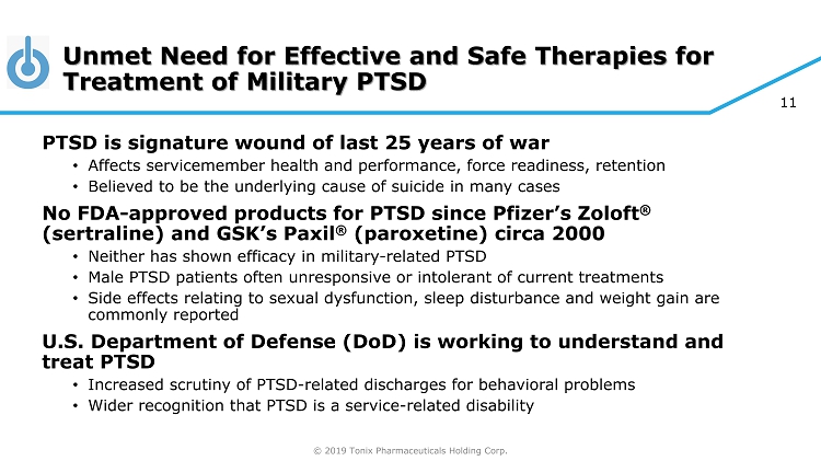 © 2019 Tonix Pharmaceuticals Holding Corp. 10 PTSD Prevalence and Market Characteristics 1 Goldstein et al., 2016 (adjusted for 2019) 2 Veterans: VA/DOD Clinical Practice Guidelines for the Managements of PTSD and Acute Stress Disorder, 2017, page 15 (619,493 vets diagnosed with PTSD in VA for 2016) 3 IMS Consulting, Market Sizing & Treatment Dynamics: Post - Traumatic Stress Disorder (PTSD) Patients", 2016 4 Bernardy et al., 2012 (80% of veterans diagnosed with PTSD had at least one medication from the Clinical Practice Guidelines) ~620k Veterans Diagnosed with PTSD in Veterans Administration (VA) 2,4 ~1.2 million Civilians Diagnosed with PTSD 3 Not Diagnosed with PTSD but some receiving treatment 3 ; ~ 9.2 million ( 84% ) Received Rx : 495,500 (~80% 4 ) No Rx : 123,900 Received Rx : 872,000 (~75% 3 ) No Rx : 288,000 Diagnosed with PTSD; ~ 1.8 million ( 16% ) Prevalent Population with PTSD (U.S.) ~12 million 1 (civilians plus veterans) Majority of diagnosed patients receive pharmacotherapy treatment