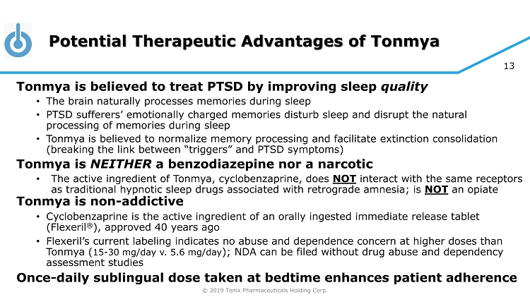 © 2019 Tonix Pharmaceuticals Holding Corp. 12 Tonmya : a Potential Bedtime Treatment for PTSD First investigational new drug to show treatment effect in military - related PTSD in two potential pivotal efficacy studies • Phase 2 study (P201/ AtEase ) showed Tonmya 5.6 mg had a strong signal of treatment effect at Week 12 as measured by CAPS - 5 1 • Phase 3 study (P301/HONOR) provided evidence of effectiveness as early as 4 weeks after treatment but diminished over time due to high placebo response − Retrospective analysis showed persistent effectiveness at Week 12 in subgroup with Time Since Trauma ≤9 years from screening • Both studies can be used as supportive evidence of efficacy and safety for Tonmya NDA submission • No serious or unexpected adverse events related to Tonmya were reported FDA feedback and acceptance on new Phase 3 study (P302/RECOVERY) received in November 2018 2 1 CAPS - 5 = Clinician - Administered PTSD Scale for DSM - 5 2 FDA Meeting Minutes, November 26, 2018