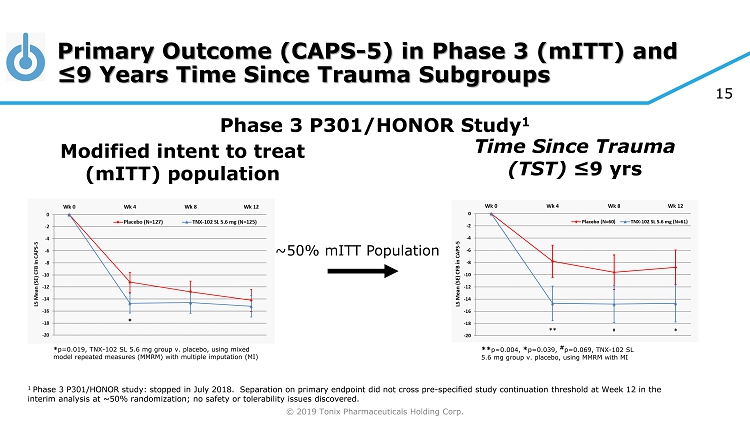 © 2019 Tonix Pharmaceuticals Holding Corp. 14 Tonmya Phase 2 Dose - Effect in Military - Related PTSD 1 1 Completed Phase 2 P201/AtEase study: Retrospective analysis of Tonmya 5.6 mg on CAPS - 5 ≥33 (high - moderate) subgroup. Primary analysis of P 201/ AtEase , based on Tonmya 2.8 mg in participants with entry CAPS - 5 ≥29 ( moderate PTSD severity), was not statistically significant. 2 CAPS - 5 = Clinician administered PTSD Scale for DSM - 5 7.2 points ** p<0.01, * p<0.025, Tonmya 5.6 mg group with placebo, MMRM with multiple imputation (MI); * p=0.018, Tonmya 2.8 mg group with placebo, MMRM with MI PTSD Symptoms (CAPS - 5 2 Score) Remission = Loss of Diagnosis and CAPS - 5 < 11 Asterisk and hashmark represent pairwise comparisons between Tonmya and Placebo; # p=0.08, Odds Ratio 3.01 (0.89, 10.18) *p=0.02, Odds Ratio 4.60 (1.27, 16.66); logistic regression 5.20% 14.30% 21.10% 0% 5% 10% 15% 20% 25% 30% Weeks 8 & 12 Percent in Remission Placebo (N=77) Tonmya 2.8 mg (N=70) Tonmya 5.6 mg (N=38) # * Remission at Weeks 8 & 12