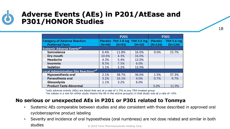 © 2019 Tonix Pharmaceuticals Holding Corp. 17 Sustained Remission in Phase 2 and Phase 3 Studies: Retrospective Analyses of P201 Entry CAPS - 5 ≥33 and P301 ≤9 Years Since Trauma Subgroups Remission is a clinical state that is essentially asymptomatic In order to confirm remission: • Determined rates of participants who met remission status at both Week 8 and Week 12 Rate of remission in ≤9 years since trauma group in P301 is similar to baseline CAPS - 5 ≥ 33 group in P201 1 1 Majority of P201 participants were ≤ 9 years since trauma and ~80% of P201 participants and all of P301 participants were ≥ 33 CAPS - 5 at baseline