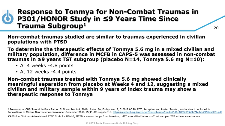© 2019 Tonix Pharmaceuticals Holding Corp. 19 Response to Tonmya for Female Participants in P301/HONOR Study 1 Females made up only 11% of the P301/HONOR study mITT population Difference in mean change from baseline in CAPS - 5 in females between placebo (N=17) and Tonmya 5.6 mg (N=10) was: • At 4 weeks - 11.5 points • At 12 weeks - 9.1 points Indicates substantial separation from placebo in the small number of female participants Predicts therapeutic response to Tonmya 5.6 mg likely in mixed civilian and military PTSD population to be studied in upcoming P302/RECOVERY trial • Civilian PTSD population tends to be about 2/3 female 1 Presented at CNS Summit in Boca Raton, FL November 1 - 4, 2018; Poster 8A, Friday Nov. 2, 5:00 - 7:00 PM EDT, Reception and Poster S ession, and abstract published in Innovations in Clinical Neuroscience, November - December 2018;15(11 - 12, suppl):S10. https://content.equisolve.net/tonixpharma/media/1d0c4055b2863fc74e1ef45f9ddaf42b.pdf