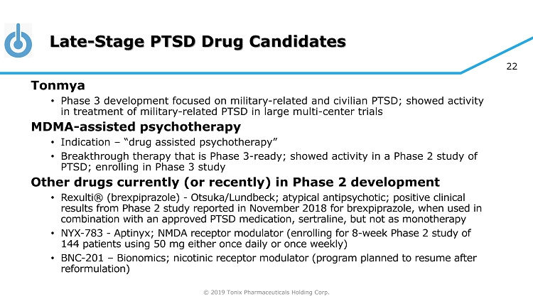 © 2019 Tonix Pharmaceuticals Holding Corp. 21 New Phase 3 P302/RECOVERY Study – Initiated 1Q 2019 Primary e ndpoint: • CAPS - 5 1 mean change from baseline at Week 4 ( Tonmya 5.6 mg vs. placebo) Key Secondary e ndpoint s include: • CAPS - 5 m ean change from baseline at W eek 12 (Tonmya 5.6 mg vs. placebo ) • Change from baseline Clinical Global Impression – Severity scale • Change from baseline Sheehan Disability Scale total score Potential pivotal efficacy study to support NDA approval Placebo once - daily at bedtime 12 weeks Tonmya once - daily at bedtime 5.6 mg (2 x 2.8 mg tablets) General s tudy c haracteristics: • Randomized, double - blind, placebo - controlle d study with baseline CAPS - 5 1 ≥ 33 in approximately 30 U.S. sites • Enrollment restricted to study participants with PTSD who experienced an index trauma ≤ 9 years from the date of screening • Both civilian and military - related PTSD to be included 1 CAPS - 5 = Clinician - Administered PTSD Scale for DSM - 5 N= 125 N= 125