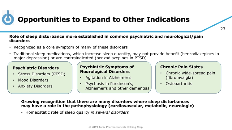 © 2019 Tonix Pharmaceuticals Holding Corp. 22 Late - Stage PTSD Drug Candidates Tonmya • Phase 3 development focused on military - related and civilian PTSD; showed activity in treatment of military - related PTSD in large multi - center trials MDMA - assisted psychotherapy • Indication – “drug assisted psychotherapy” • Breakthrough therapy that is Phase 3 - ready; showed activity in a Phase 2 study of PTSD; enrolling in Phase 3 study Other drugs currently (or recently) in Phase 2 development • Rexulti ® ( brexpiprazole ) - Otsuka/Lundbeck; atypical antipsychotic; positive clinical results from Phase 2 study reported in November 2018 for brexpiprazole , when used in combination with an approved PTSD medication, sertraline, but not as monotherapy • NYX - 783 - Aptinyx ; NMDA receptor modulator (enrolling for 8 - week Phase 2 study of 144 patients using 50 mg either once daily or once weekly) • BNC - 201 – Bionomics; nicotinic receptor modulator (program planned to resume after reformulation)