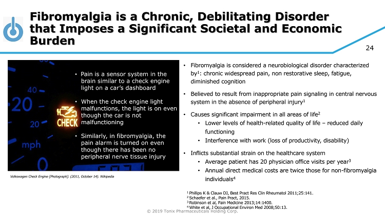 © 2019 Tonix Pharmaceuticals Holding Corp. 24 Volkswagen Check Engine [Photograph]. (2011, October 14). Wikipedia • Pain is a sensor system in the brain similar to a check engine light on a car’s dashboard • When the check engine light malfunctions, the light is on even though the car is not malfunctioning • Similarly, in fibromyalgia, the pain alarm is turned on even though there has been no peripheral nerve tissue injury • Fibromyalgia is considered a neurobiological disorder characterized by 1 : chronic widespread pain, non restorative sleep, fatigue, diminished cognition • Believed to result from inappropriate pain signaling in central nervous system in the absence of peripheral injury 1 • Causes significant impairment in all areas of life 2 • Lower levels of health - related quality of life – reduced daily functioning • Interference with work (loss of productivity, disability) • Inflicts substantial strain on the healthcare system • Average patient has 20 physician office visits per year 3 • Annual direct medical costs are twice those for non - fibromyalgia individuals 4 Fibromyalgia is a Chronic, Debilitating Disorder that Imposes a Significant Societal and Economic Burden 1 Phillips K & Clauw DJ, Best Pract Res Clin Rheumatol 2011;25:141. 2 Schaefer et al., Pain Pract , 2015. 3 Robinson et al, Pain Medicine 2013;14:1400. 4 White et al, J Occupational Environ Med 2008;50:13.