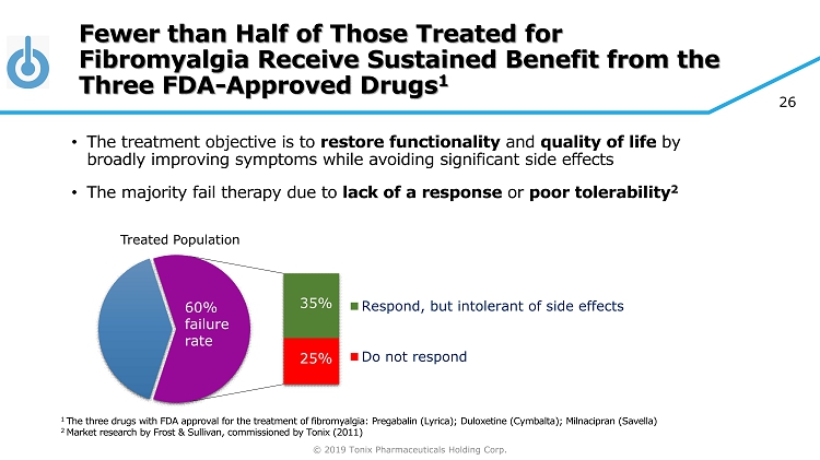© 2019 Tonix Pharmaceuticals Holding Corp. 25 Fibromyalgia: Market Characteristics Undiagnosed ~2.7 million Drug Treated 85% 3 2,366,400 No Drug 15%3 353,600 U.S. Prevalence Rate 2 - 4% 1 (~5 - 10 million adults) Diagnosed 2 ~2.7 million Market Characteristics Prevalence • One of the more common chronic pain disorders Diagnosed population • Large population (~2.7 million) but underdiagnosed relative to prevalence rate • Majority receive drug treatment Treatment Pattern • Polypharmacy the norm - average 2.6 drugs/patient 3 • Rotation through therapy common: average ~5 drugs/year 3 • Estimated that >22 million prescriptions are issued for the treatment of fibromyalgia (on - and off - label usage) each year 4,5 Unmet Need • Majority of patients do not respond or cannot tolerate therapy 6 1. American College of Rheumatology ( www.ACRPatientInfo.org accessed May 7, 2019) – prevalence rate of 2 - 4% for U.S. adult population (~250 million) 2. Vincent et al., 2013; diagnosed prevalence rate was 1.1% of adult population or 50% of the prevalent population 3. Robinson, et al., 2012; 85% received drug treatment 4. Vincent et al, Arthritis Care Res 2013;65:786 5. Product sales derived from IMS MIDAS; IMS NDTI used to factor usage for fibromyalgia; data accessed April 2015. 6. Market research by Frost & Sullivan, commissioned by Tonix , 2011