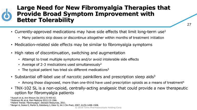 © 2019 Tonix Pharmaceuticals Holding Corp. 26 Fewer than Half of Those Treated for Fibromyalgia Receive Sustained Benefit from the Three FDA - Approved Drugs 1 • The treatment objective is to restore functionality and quality of life by broadly improving symptoms while avoiding significant side effects • The majority fail therapy due to lack of a response or poor tolerability 2 Respond, but intolerant of side effects Do not respond 25% 35% 60% failure rate 1 The three drugs with FDA approval for the treatment of fibromyalgia: Pregabalin (Lyrica); Duloxetine (Cymbalta); Milnacipran ( Savella ) 2 Market research by Frost & Sullivan, commissioned by Tonix (2011) Treated Population