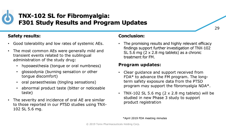 © 2019 Tonix Pharmaceuticals Holding Corp. 28 TNX - 102 SL for Fibromyalgia: Summary of a completed Phase 3 F301 study General s tudy c haracteristics: • Randomized, 12 - week, double - blind, placebo - controlle d Phase 3 study of TNX - 102 SL 2.8 mg (half the dose being developed for PTSD) taken daily at bedtime • Patients had to satisfy the 2010 ACR Preliminary Diagnostic Classification Criteria • Primary endpoint: Weekly average pain improvement as a 30% responder analysis • Secondary endpoints: PGIC, FIQ - R Symptom Domain, FIQ - F Function Domain, Daily Sleep Quality Diary, PROMIS Sleep Disturbance Efficacy results: • mITT population: 425 (81.9%) of 519 patients • The primary analysis was not statistically significant. However, retrospective analysis showed average pain improvement (secondary endpoint) after 12 weeks of treatment showed statistical significance (P<0.05, MMRM) • Significant improvements observed in sleep quality, patient global impression of change and fibromyalgia - specific measures (secondary analyses).