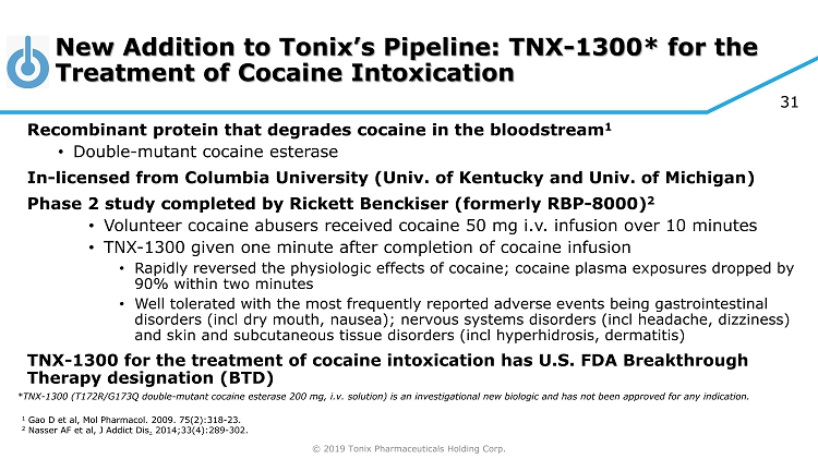 © 2019 Tonix Pharmaceuticals Holding Corp. 32 About TNX - 1300 Produced through rDNA technology in non - disease - producing strain of E. coli. • Cocaine Esterase ( CocE ) was identified in bacteria ( Rhodococcus ) that use cocaine as its sole source of carbon and nitrogen and that grow in soil surrounding coca plants 1 • The gene encoding CocE was identified and the protein was extensively characterized 1 - 3 • CocE catalyzes the breakdown of cocaine into metabolite ecgonine methyl ester and benzoic acid • Wild - type CocE is unstable at body temperature, so targeted mutations were introduced in the CocE gene and resulted in the T172R/G173Q Double - Mutant CocE , which is active for approximately 6 hours at body temperature 4 1 Bresler MM et al, Appl Environ Microbiol. 2000. 66(3):904 - 8. 2 Larsen NA et al, Nat Struct Biol. 2002. 9(1):17 - 21. 3 Turner JM et al, Biochemistry. 2002. 41(41):12297 - 307. 4 Gao D et al, Mol Pharmacol . 2009. 75(2):318 - 23.