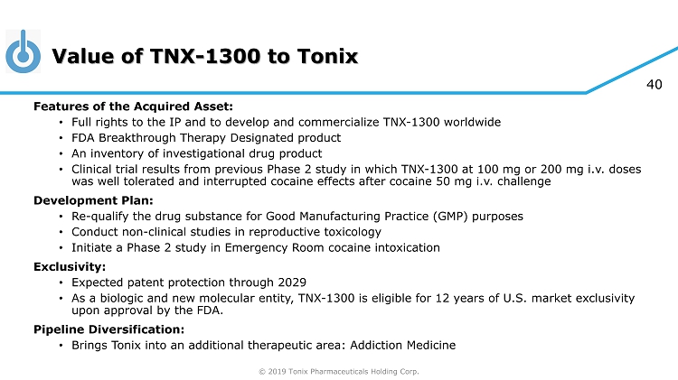 © 2019 Tonix Pharmaceuticals Holding Corp. 39 Treatment for Cocaine Intoxication Current Standard of Care • Patients present with acute agitation, hyperthermia, tachycardia, arrhythmias, and hypertension • Potential life - threatening sequalae of myocardial infarction, cerebrovascular accident, rhabdomyolysis, respiratory failure, and seizures • Patients are currently managed only by supportive care for the adverse effects of cocaine intoxication on the cardiovascular and central nervous systems Potential Benefit of TNX - 1300 • By reversing the cause of cocaine intoxication (rather than treating the symptoms), TNX - 1300 may offer significant advantages to the current standard of care for cocaine intoxication. • Rapid diminution in circulating cocaine • Significantly reduce time and resources required for other detox services • Reduces the risk of morbidity and mortality