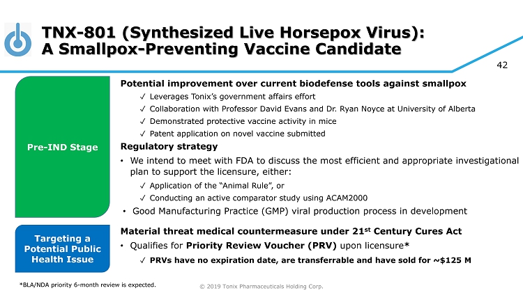 © 2019 Tonix Pharmaceuticals Holding Corp. 42 TNX - 801 (Synthesized Live Horsepox Virus): A Smallpox - Preventing Vaccine Candidate Pre - IND Stage Potential improvement over current biodefense tools against smallpox ✓ Leverages Tonix’s government affairs effort ✓ Collaboration with Professor David Evans and Dr. Ryan Noyce at University of Alberta ✓ Demonstrated protective vaccine activity in mice ✓ Patent application on novel vaccine submitted Regulatory strategy • We intend to meet with FDA to discuss the most efficient and appropriate investigational plan to support the licensure, either: ✓ Application of the “Animal Rule”, or ✓ Conducting an active comparator study using ACAM2000 • Good Manufacturing Practice (GMP) viral production process in development Targeting a Potential Public Health Issue Material threat medical countermeasure under 21 st Century Cures Act • Qualifies for Priority Review Voucher (PRV) upon licensure * ✓ PRVs have no expiration date, are transferrable and have sold for ~$125 M *BLA/NDA priority 6 - month review is expected.