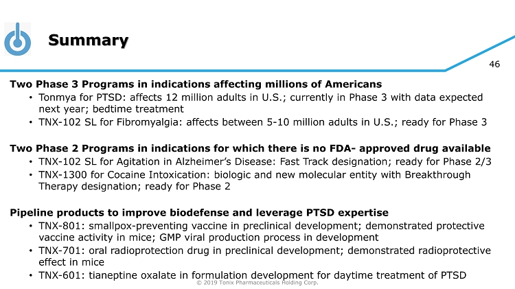 © 2019 Tonix Pharmaceuticals Holding Corp. 45 Milestones – Recently Completed and Upcoming □ July 201 8 Completed P301/HONOR study interim analysis - result did not support study continuation but strengthened new Phase 3 study □ August 201 8 Presentation of P301/HONOR study results at Military Health System Scientific Symposium □ October 201 8 Met with FDA and received preliminary agreement on the design of new Phase 3 study of Tonmya for PTSD (P302/RECOVERY study) □ November 201 8 Received FDA minutes confirming agreement on the design of P302/RECOVERY study □ March 2019 Met with FDA to discuss new FM Phase 3 study design using TNX - 102 SL 5.6 mg □ March 2019 P302/RECOVERY study initiated □ April 2019 Received FDA formal minutes with clear guidance and support on new Phase 3 FM study □ May 2019 In - licensed TNX - 1300, BTD product in Phase 2 development for cocaine intoxication □ Second Half 2019 P reliminary human pharmacokinetic and safety data (non - IND study) from selected TNX - 601 (tianeptine oxalate) formulation expected □ First Half 2020 Topline data from P302/RECOVERY study expected x x x x x x x x