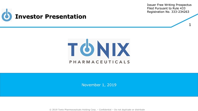 © 2019 Tonix Pharmaceuticals Holding Corp. – Confidential – Do not duplicate or distribute 1 November 1, 2019 Investor Presentation Issuer Free Writing Prospectus Filed Pursuant to Rule 433 Registration No. 333 - 234263