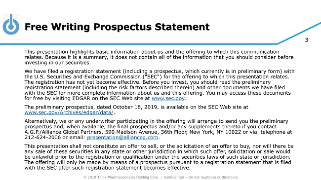 3 © 2019 Tonix Pharmaceuticals Holding Corp. – Confidential – Do not duplicate or distribute Free Writing Prospectus Statement This presentation highlights basic information about us and the offering to which this communication relates. Because it is a summary, it does not contain all of the information that you should consider before investing in our securities. We have filed a registration statement (including a prospectus, which currently is in preliminary form) with the U.S. Securities and Exchange Commission ("SEC") for the offering to which this presentation relates. The registration has not yet become effective. Before you invest, you should read the preliminary registration statement (including the risk factors described therein) and other documents we have filed with the SEC for more complete information about us and this offering. You may access these documents for free by visiting EDGAR on the SEC Web site at www.sec.gov . The preliminary prospectus, dated October 18, 2019, is available on the SEC Web site at www.sec.gov/Archives/edgar/data/ . Alternatively, we or any underwriter participating in the offering will arrange to send you the preliminary prospectus and, when available, the final prospectus and/or any supplements thereto if you contact A.G.P./Alliance Global Partners, 590 Madison Avenue, 36th Floor, New York, NY 10022 or via telephone at 212 - 624 - 2006 or email: presentation@allianceg.com . This presentation shall not constitute an offer to sell, or the solicitation of an offer to buy, nor will there be any sale of these securities in any state or other jurisdiction in which such offer, solicitation or sale would be unlawful prior to the registration or qualification under the securities laws of such state or jurisdiction. The offering will only be made by means of a prospectus pursuant to a registration statement that is filed with the SEC after such registration statement becomes effective.