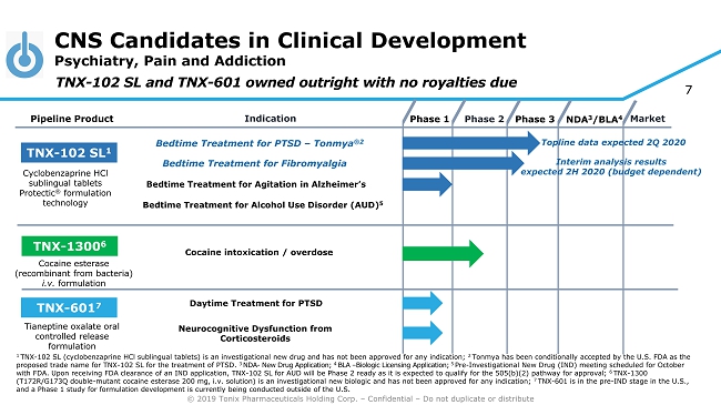 6 © 2019 Tonix Pharmaceuticals Holding Corp. – Confidential – Do not duplicate or distribute Management Team Seth Lederman, MD President & CEO Jessica Morris Chief Operating Officer Gregory Sullivan, MD Chief Medical Officer Bradley Saenger, CPA Chief Financial Officer