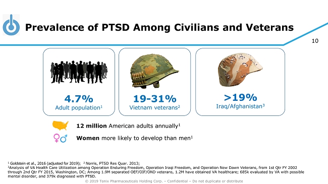 10 © 2019 Tonix Pharmaceuticals Holding Corp. – Confidential – Do not duplicate or distribute Prevalence of PTSD Among Civilians and Veterans 1 Goldstein et al., 2016 (adjusted for 2019) ; 2 Norris, PTSD Res Quar. 2013; 3 Analysis of VA Health Care Utilization among Operation Enduring Freedom, Operation Iraqi Freedom, and Operation New Dawn Vete ran s, from 1st Qtr FY 2002 through 2nd Qtr FY 2015, Washington, DC ; Among 1.9M separated OEF/OIF/OND veterans, 1.2M have obtained VA healthcare; 685k evaluated by VA with possible mental disorder, and 379k diagnosed with PTSD. >19% Iraq/Afghanistan 3 4.7% Adult population 1 19 - 31% Vietnam veterans 2 12 million American adults annually 1 Women more likely to develop than men 1