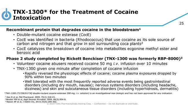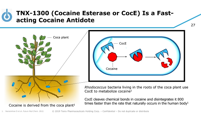 © 2019 Tonix Pharmaceuticals Holding Corp. – Confidential – Do not duplicate or distribute 25 TNX - 1300* for the Treatment of Cocaine Intoxication Recombinant protein that degrades cocaine in the bloodstream 1 • Double - mutant cocaine esterase ( CocE ) • CocE was identified in bacteria ( Rhodococcus ) that use cocaine as its sole source of carbon and nitrogen and that grow in soil surrounding coca plants 2 • CocE catalyzes the breakdown of cocaine into metabolites ecgonine methyl ester and benzoic acid Phase 2 study comp leted by Rickett Benckiser (TNX - 1300 was formerly RBP - 8000) 3 • Volunteer cocaine abusers received cocaine 50 mg i.v. infusion over 10 minutes • TNX - 1300 given one minute after completion of cocaine infusion • Rapidly reversed the physiologic effects of cocaine; cocaine plasma exposures dropped by 90% within two minutes • Well tolerated with the most frequently reported adverse events being gastrointestinal disorders ( including dry mouth, nausea); nervous systems disorders (including headache, dizziness) and skin and subcutaneous tissue disorders (including hyperhidrosis , dermatitis) *TNX - 1300 (T172R/G173Q double - mutant cocaine esterase 200 mg, i.v. solution) is an investigational new biologic and has not been approved for any indication. 1 Gao D et al, Mol Pharmacol . 2009. 75(2):318 - 23. 2 Bresler MM et al, Appl Environ Microbiol . 2000. 66(3):904 - 8. 3 Nasser AF et al, J Addict Dis . 2014;33(4):289 - 302.