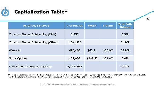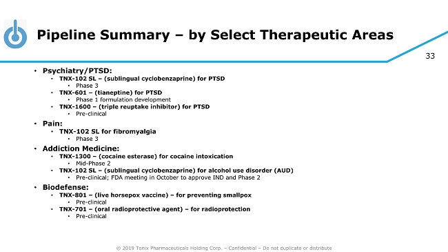 32 © 2019 Tonix Pharmaceuticals Holding Corp. – Confidential – Do not duplicate or distribute Capitalization Table* As of 10/31/2019 # of Shares WAEP $ Value % of Fully Diluted Common Shares Outstanding (D&O) 6,853 0.3% Common Shares Outstanding (Other) 1,564,888 71.9% Warrants 496,486 $42.14 $20.9M 22.8% Stock Options 109,036 $199.57 $21.8M 5.0% Fully Diluted Shares Outstanding 2,177,263 100% *All share and dollar amounts reflect a 1 - for - 10 reverse stock split which will be effective for trading purposes as of the comm encement of trading on November 1, 2019. Any fractional share of common stock that would otherwise result from the reverse stock split will be rounded to a whole shar e.
