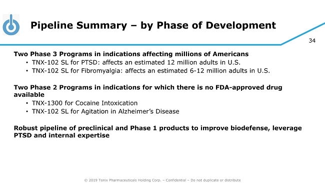 33 © 2019 Tonix Pharmaceuticals Holding Corp. – Confidential – Do not duplicate or distribute Pipeline Summary – by Select Therapeutic Areas • Psychiatry/PTSD: • TNX - 102 SL – (sublingual cyclobenzaprine) for PTSD • Phase 3 • TNX - 601 – (tianeptine) for PTSD • Phase 1 formulation development • TNX - 1600 – (triple reuptake inhibitor) for PTSD • Pre - clinical • Pain: • TNX - 102 SL for fibromyalgia • Phase 3 • Addiction Medicine: • TNX - 1300 – (cocaine esterase) for cocaine intoxication • Mid - Phase 2 • TNX - 102 SL – (sublingual cyclobenzaprine) for alcohol use disorder (AUD) • Pre - clinical; FDA meeting in October to approve IND and Phase 2 • Biodefense: • TNX - 801 – (live horsepox vaccine) – for preventing smallpox • Pre - clinical • TNX - 701 – (oral radioprotective agent) – for radioprotection • Pre - clinical