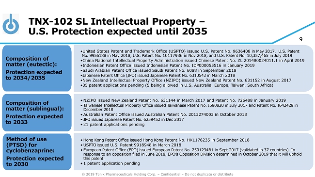 8 © 2019 Tonix Pharmaceuticals Holding Corp. – Confidential – Do not duplicate or distribute Preclinical Pipeline 1 1 (Experimental new medicines and biologics, not approved for any indication 2 (2S,4R,5R) - 5 - (((2 - aminobenzo[d]thiazol - 6 - yl)methyl)amino) - 2 - (bis(4 - fluorophenyl)methyl)tetrahydro - 2H - pyran - 4 - ol) is an inhibitor of reuptake of three monoamine neurotransmitters (serotonin, norepinephrine and dopamine) 3 Programs owned outright with no royalties due 4 recombinant Trefoil Family Factor 2 Category Pipeline Product Indication(s) TNX - 801 3 Potential smallpox - preventing vaccine Live horsepox virus (HPXV) vaccine from cell culture TNX - 701 3 Protection from radiation injury Radioprotection drug oral capsules Triple reuptake inhibitor 2 TNX - 1600 Daytime Treatment for PTSD Psychiatry TNX - 1500 3 Anti - CD154 monoclonal antibody Prevention and treatment of organ transplant rejection Potential treatment for autoimmune conditions including systemic lupus erythematosus, rheumatoid arthritis and multiple sclerosis Autoimmunity Transplant TNX - 1700 rTFF2 4 Treatment for gastric and pancreatic cancers Oncology Biodefense Biodefense