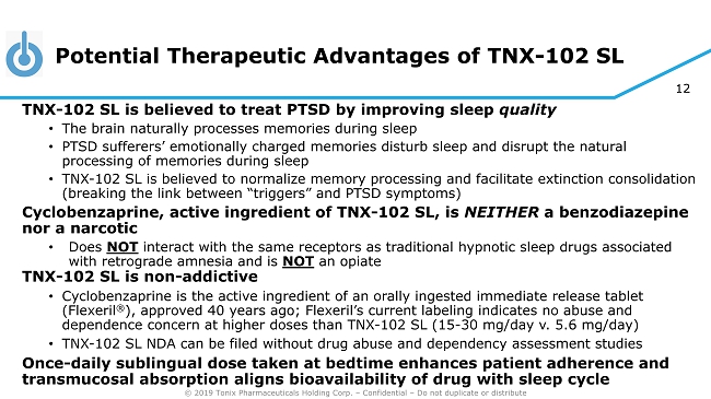 11 © 2019 Tonix Pharmaceuticals Holding Corp. – Confidential – Do not duplicate or distribute Unmet Need for Effective and Safe Therapies for Treatment of PTSD No FDA - approved products for PTSD since Pfizer’s Zoloft ® (sertraline) in 1999 and GSK’s Paxil ® (paroxetine) in 2001 • Neither has shown efficacy in military - related PTSD • Side effects relating to sexual dysfunction, sleep disruption and weight gain are commonly reported PTSD is signature wound of last 25 years of war • Affects servicemember health and performance, force readiness, and retention • Believed to be the underlying cause of suicide in many cases • Male PTSD patients often unresponsive or intolerant of current treatments Civilian PTSD is more prevalent than military • Results from physical and sexual assault trauma, vehicular accidents, natural disasters • Significant cause of morbidity