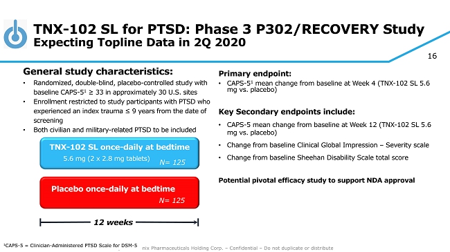 15 © 2019 Tonix Pharmaceuticals Holding Corp. – Confidential – Do not duplicate or distribute Adverse Events (AEs) in P201/AtEase and P301/HONOR Studies No serious or unexpected AEs in P201 or P301 related to TNX - 102 SL • Systemic AEs comparable between studies and also consistent with those described in approved oral cyclobenzaprine product labeling • Severity and incidence of oral hypoesthesia (oral numbness) are not dose related and similar in both studies # only adverse events (AEs) are listed that are at a rate of ≥ 5% in any TNX - treated group *no values in a row for either study means the AE in the active group(s) in that study was at a rate of <5%