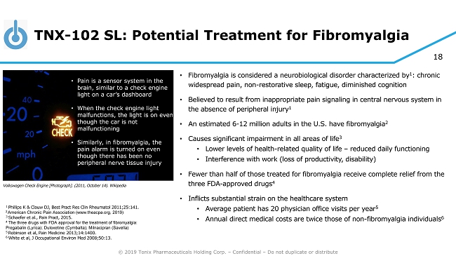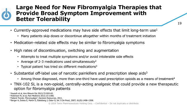 18 © 2019 Tonix Pharmaceuticals Holding Corp. – Confidential – Do not duplicate or distribute Volkswagen Check Engine [Photograph]. (2011, October 14). Wikipedia • Pain is a sensor system in the brain, similar to a check engine light on a car’s dashboard • When the check engine light malfunctions, the light is on even though the car is not malfunctioning • Similarly, in fibromyalgia, the pain alarm is turned on even though there has been no peripheral nerve tissue injury • Fibromyalgia is considered a neurobiological disorder characterized by 1 : chronic widespread pain, non - restorative sleep, fatigue, diminished cognition • Believed to result from inappropriate pain signaling in central nervous system in the absence of peripheral injury 1 • An estimated 6 - 12 million adults in the U.S. have fibromyalgia 2 • Causes significant impairment in all areas of life 3 • Lower levels of health - related quality of life – reduced daily functioning • Interference with work (loss of productivity, disability) • Fewer than half of those treated for fibromyalgia receive complete relief from the three FDA - approved drugs 4 • Inflicts substantial strain on the healthcare system • Average patient has 20 physician office visits per year 5 • Annual direct medical costs are twice those of non - fibromyalgia individuals 6 TNX - 102 SL: Potential Treatment for Fibromyalgia 1 Phillips K & Clauw DJ, Best Pract Res Clin Rheumatol 2011;25:141. 2 American Chronic Pain Association (www.theacpa.org, 2019) 3 Schaefer et al., Pain Pract , 2015. 4 The three drugs with FDA approval for the treatment of fibromyalgia: Pregabalin (Lyrica); Duloxetine (Cymbalta); Milnacipran ( Savella ) 5 Robinson et al, Pain Medicine 2013;14:1400. 6 White et al, J Occupational Environ Med 2008;50:13.