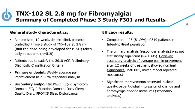 19 © 2019 Tonix Pharmaceuticals Holding Corp. – Confidential – Do not duplicate or distribute Large Need for New Fibromyalgia Therapies that Provide Broad Symptom Improvement with Better Tolerability • Currently - approved medications may have side effects that limit long - term use 1 • Many patients skip doses or discontinue altogether within months of treatment initiation • Medication - related side effects may be similar to fibromyalgia symptoms • High rates of discontinuation, switching and augmentation • A ttempts to treat multiple symptoms and/or avoid intolerable side effects • Average of 2 - 3 medications used simultaneously 2 • Typical patient has tried six different medications 3 • Substantial off - label use of narcotic painkillers and prescription sleep aids 3 • Among those diagnosed, more than one - third have used prescription opioids as a means of treatment 4 • TNX - 102 SL is a non - opioid, centrally - acting analgesic that could provide a new therapeutic option for fibromyalgia patients 1 Nuesch et al, Ann Rheum Dis 2013;72:955 - 62. 2 Robinson RL et al, Pain Medicine 2012;13:1366. 3 Patient Trends: Fibromyalgia”, Decision Resources, 2011. 4 Berger A, Dukes E, Martin S, Edelsberg J, Oster G, Int J Clin Pract , 2007; 61(9):1498 – 1508.
