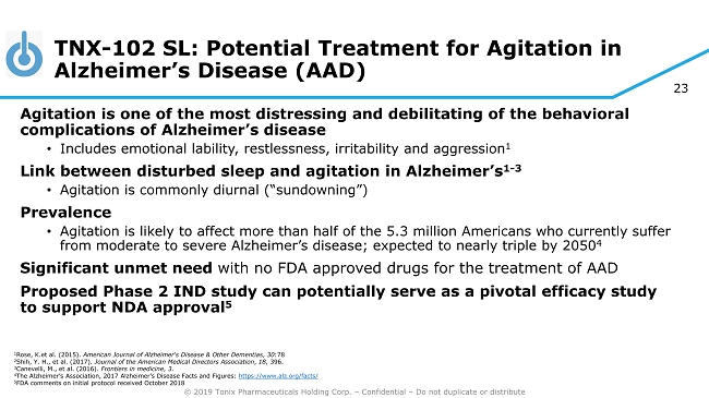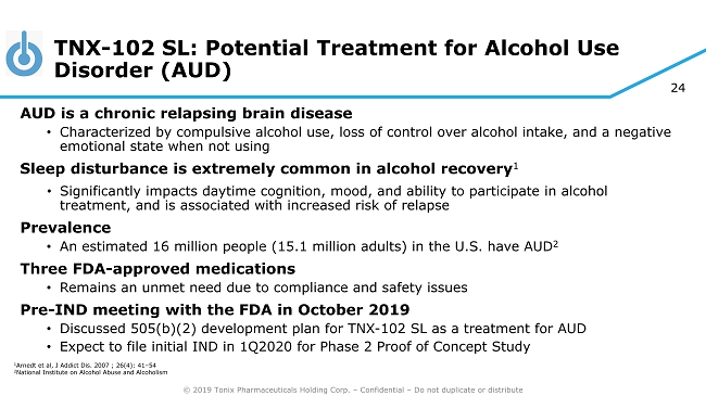 23 © 2019 Tonix Pharmaceuticals Holding Corp. – Confidential – Do not duplicate or distribute TNX - 102 SL: Potential Treatment for Agitation in Alzheimer’s Disease (AAD) Agitation is one of the most distressing and debilitating of the behavioral complications of Alzheimer’s disease • Includes emotional lability, restlessness, irritability and aggression 1 Link between disturbed sleep and agitation in Alzheimer’s 1 - 3 • Agitation is commonly diurnal (“ sundowning ”) Prevalence • Agitation is likely to affect more than half of the 5.3 million Americans who currently suffer from moderate to severe Alzheimer’s disease; expected to nearly triple by 2050 4 Significant unmet need with no FDA approved drugs for the treatment of AAD Proposed Phase 2 IND study can potentially serve as a pivotal efficacy study to support NDA approval 5 1 Rose, K.et al. (2015). American Journal of Alzheimer's Disease & Other Dementias , 30 :78 2 Shih, Y. H., et al. (2017). Journal of the American Medical Directors Association , 18 , 396. 3 Canevelli, M., et al. (2016). Frontiers in medicine , 3 . 4 The Alzheimer’s Association, 2017 Alzheimer’s Disease Facts and Figures: https://www.alz.org/facts/ 5 FDA comments on initial protocol received October 2018
