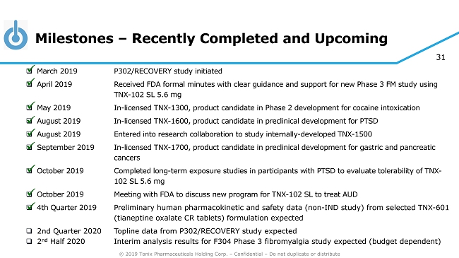 © 2019 Tonix Pharmaceuticals Holding Corp. – Confidential – Do not duplicate or distribute 30 TNX - 601* for PTSD Pharmacokinetic and safety study (ex - U.S.) of controlled release (CR) formulations underway • Targeting CR formulation for once - daily dosing Pre - IND meeting with FDA expected first half 2020 • Discussion of clinical development plan for TNX - 601 for PTSD • IND expected to be based on ex - U.S. findings from pharmacokinetic and safety studies Clinical studies of tianeptine sodium immediate release (IR) in PTSD • Published studies show tianeptine is active in the treatment of PTSD 1 - 4 1 Frančišković T, et al. Psychiatr Danub . 2011 Sep;23(3):257 - 63. PMID: 21963693 2 Rumyantseva GM and, Stepanov AL. Neurosci Behav Physiol. 2008 Jan;38(1):55 - 61. PMID: 18097761 3 Aleksandrovskiĭ IA, et al. Zh Nevrol Psikhiatr Im S S Korsakova . 2005;105(11):24 - 9. PMID: 16329631 [Russian] 4 Onder E, et al. Eur Psychiatry. 2006 (3):174 - 9. PMID: 15964747 *TNX - 601 (tianeptine oxalate CR tablets) is an investigational new drug and has not been approved for any indication.