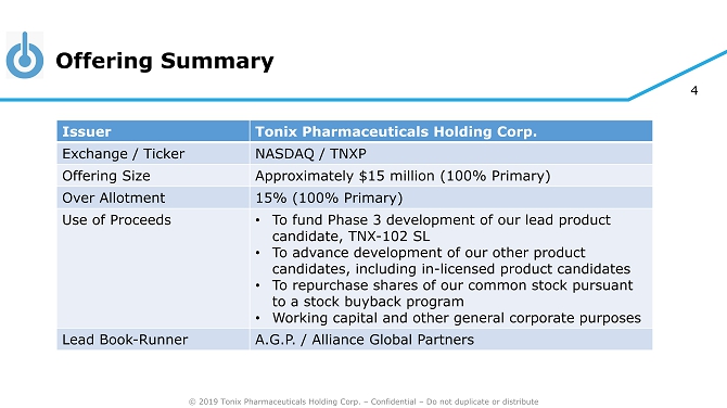 3 © 2019 Tonix Pharmaceuticals Holding Corp. – Confidential – Do not duplicate or distribute Free Writing Prospectus Statement This presentation highlights basic information about us and the offering to which this communication relates. Because it is a summary, it does not contain all of the information that you should consider before investing in our securities. We have filed a registration statement (including a prospectus, which currently is in preliminary form) with the U.S. Securities and Exchange Commission ("SEC") for the offering to which this presentation relates. The registration has not yet become effective. Before you invest, you should read the preliminary registration statement (including the risk factors described therein) and other documents we have filed with the SEC for more complete information about us and this offering. You may access these documents for free by visiting EDGAR on the SEC Web site at www.sec.gov . The preliminary prospectus, dated October 18, 2019, is available on the SEC Web site at www.sec.gov/Archives/edgar/data/ . Alternatively, we or any underwriter participating in the offering will arrange to send you the preliminary prospectus and, when available, the final prospectus and/or any supplements thereto if you contact A.G.P./Alliance Global Partners, 590 Madison Avenue, 36th Floor, New York, NY 10022 or via telephone at 212 - 624 - 2006 or email: presentation@allianceg.com . This presentation shall not constitute an offer to sell, or the solicitation of an offer to buy, nor will there be any sale of these securities in any state or other jurisdiction in which such offer, solicitation or sale would be unlawful prior to the registration or qualification under the securities laws of such state or jurisdiction. The offering will only be made by means of a prospectus pursuant to a registration statement that is filed with the SEC after such registration statement becomes effective.