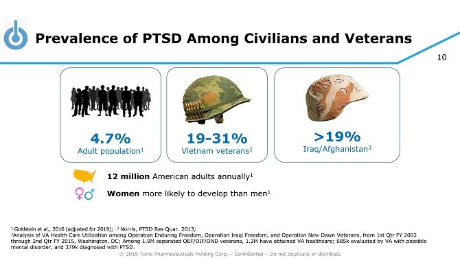 11 © 2019 Tonix Pharmaceuticals Holding Corp. – Confidential – Do not duplicate or distribute Unmet Need for Effective and Safe Therapies for Treatment of PTSD No FDA - approved products for PTSD since Pfizer’s Zoloft ® (sertraline) in 1999 and GSK’s Paxil ® (paroxetine) in 2001 • Neither has shown efficacy in military - related PTSD • Side effects relating to sexual dysfunction, sleep disruption and weight gain are commonly reported PTSD is signature wound of last 25 years of war • Affects servicemember health and performance, force readiness, and retention • Believed to be the underlying cause of suicide in many cases • Male PTSD patients often unresponsive or intolerant of current treatments Civilian PTSD is more prevalent than military • Results from physical and sexual assault trauma, vehicular accidents, natural disasters • Significant cause of morbidity